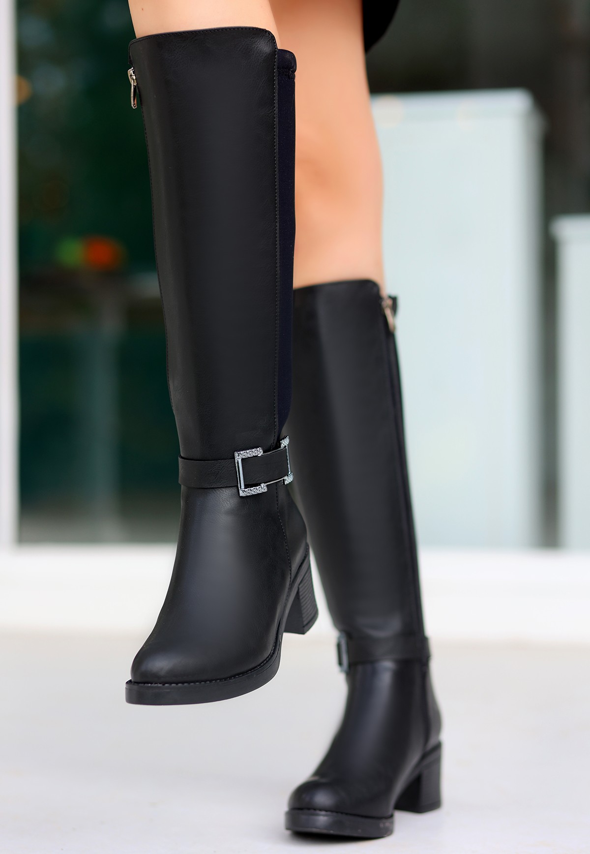 Detay: Topuklu Yandan Fermuarlı Arka Kısmı Streç Diz Altı Çizme