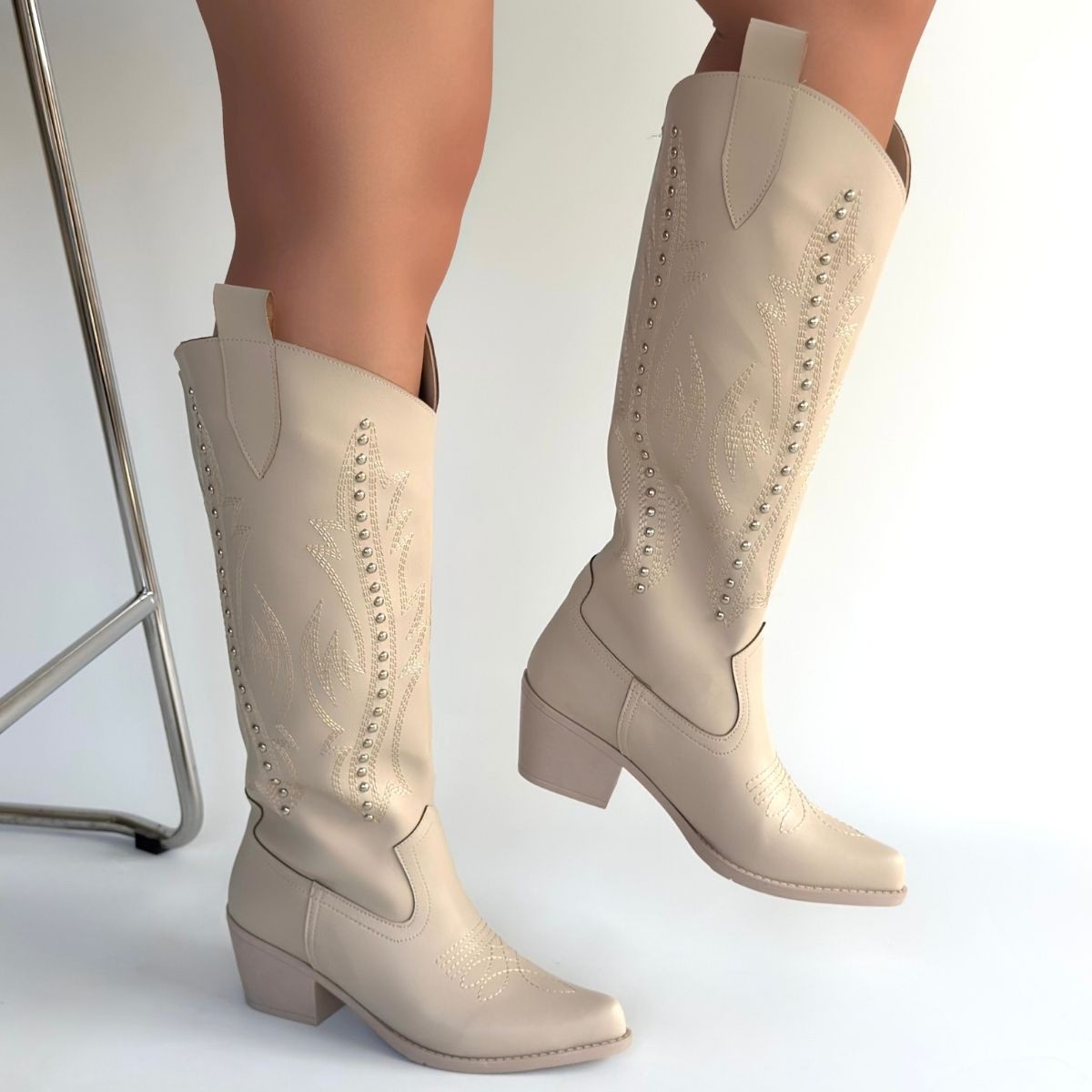 Çizme Meof Bej Cilt Topuklu Çizme