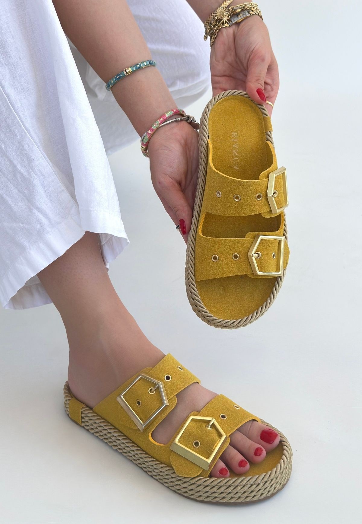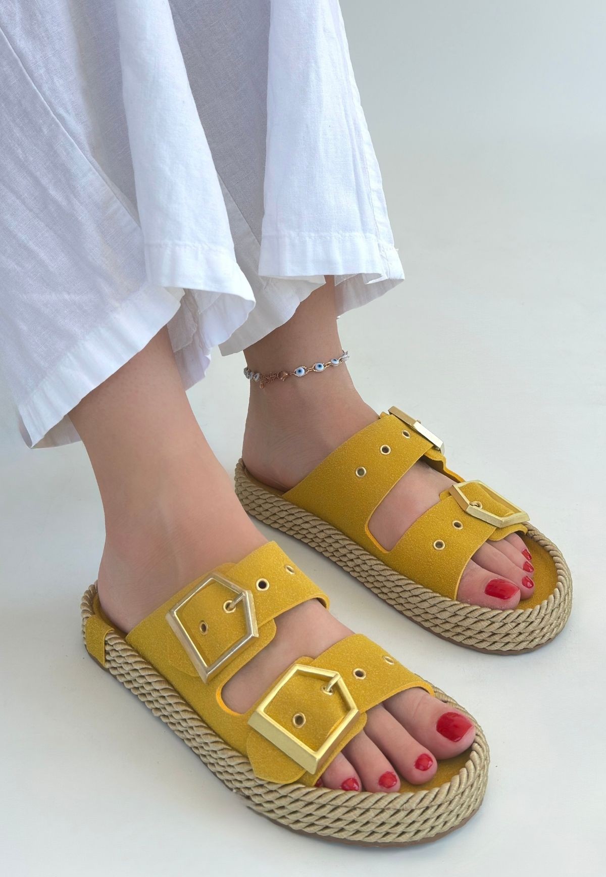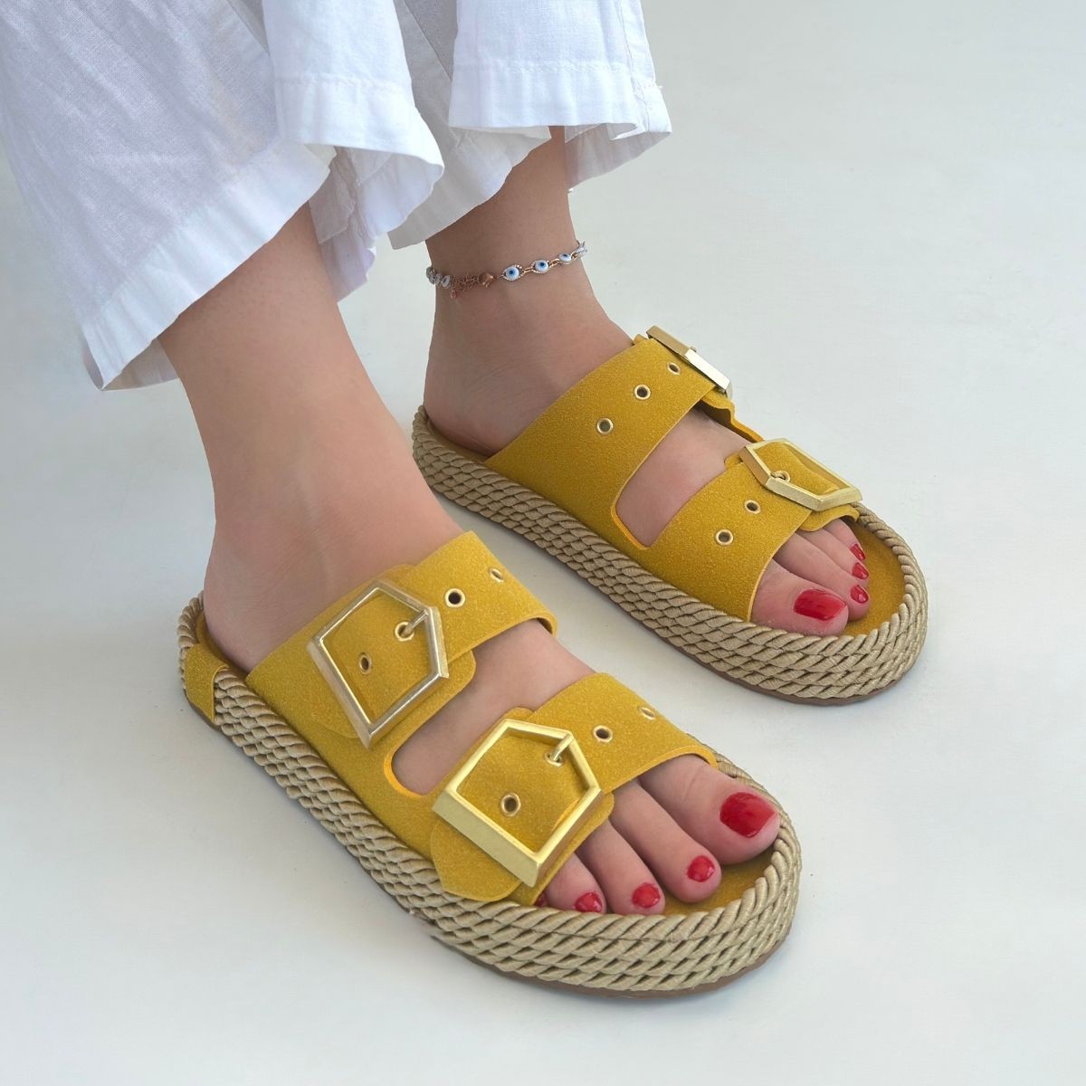 Loera Sarı Nubuk Çift Tokalı Terlik