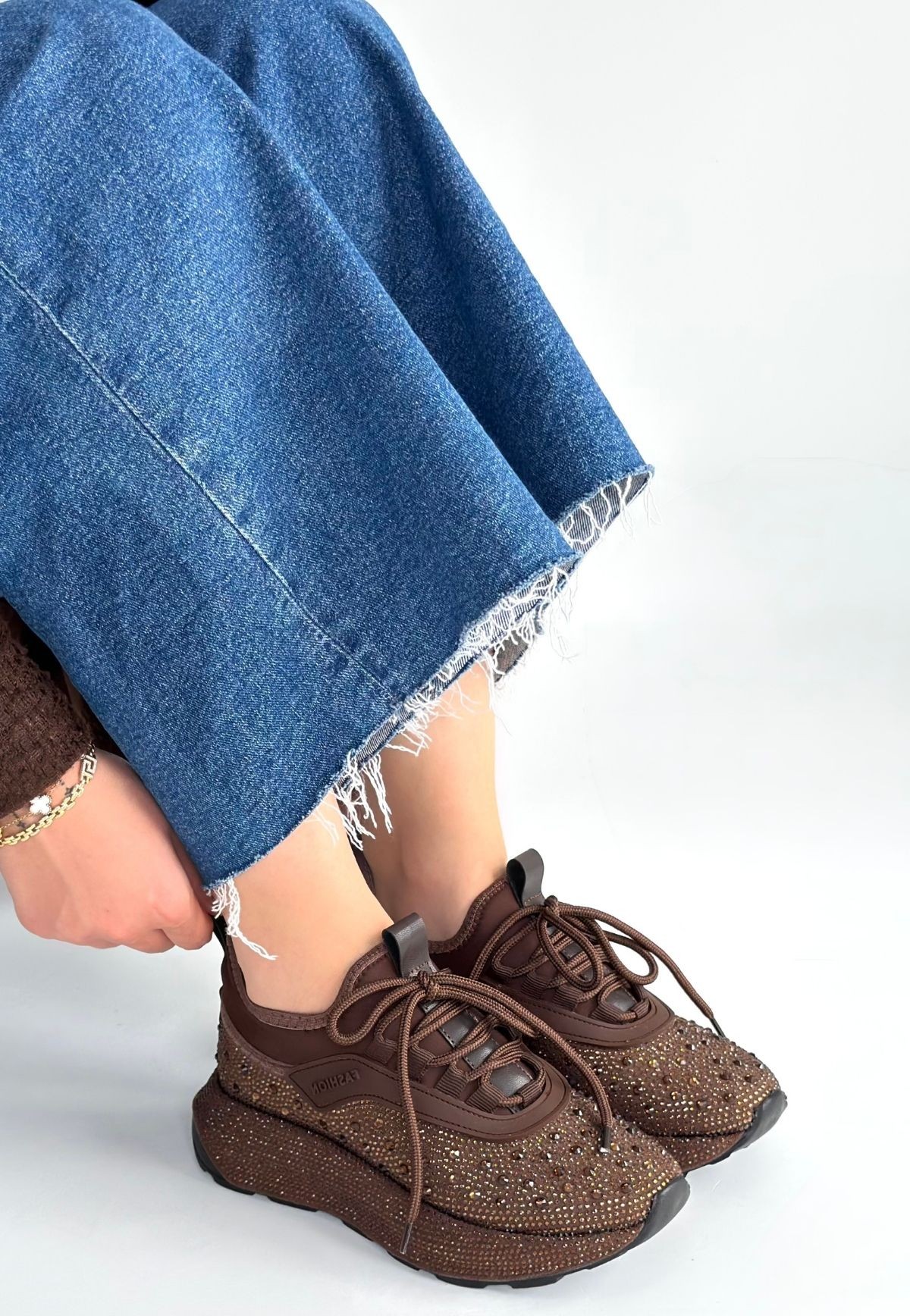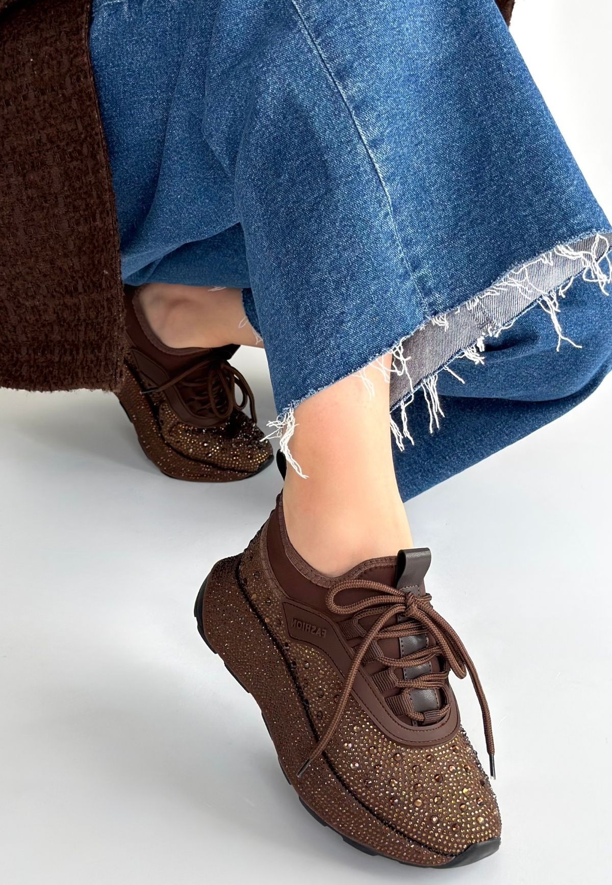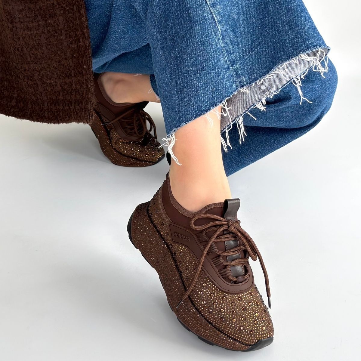 • Rimay Kahverengi Cilt Boncuk İşlemeli Spor Ayakkabı
