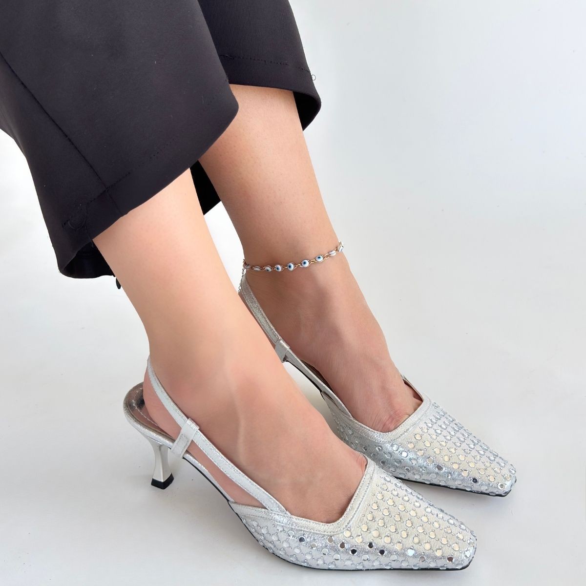 • Sione Gümüş Cilt Topuklu Ayakkabı