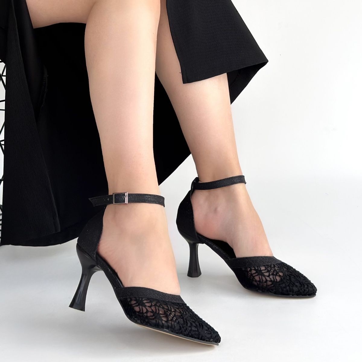 • Weja Siyah Cilt Tül Detaylı Topuklu Ayakkabı